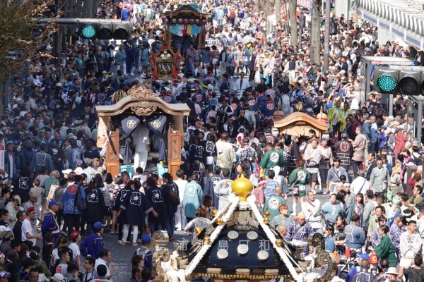 逗子市の中心部を舞台に、色とりどりの神輿が威勢よく練り歩きます。